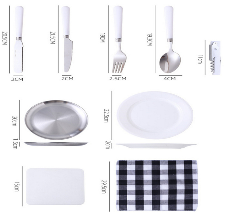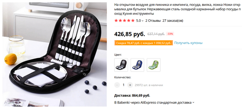 Легкий и компактный набор для пикника-кемпинга в удобной упаковке. Стоит 1300 рублей (если найти вариант с бесплатной доставкой, то он будет стоить где-то 1450), есть три варианта расцветки. Набор для двоих: двойной комплект ложек, вилок, ножей, нож-пилка, открывалка-пробочник, две тарелки, две тканевых салфетки. Утверждается, что сделано из нержавеющей стали.
