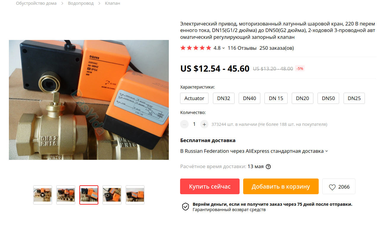Давно хотелось сделать автоматическое перекрытие воды в доме, на случай протечки. Хотел электромагнитный клапан, чтобы мгновенно срабатывал если что, но он либо нормально закрытый, и тогда будет всегда под напряжением, либо нормально закрытый, тогда вода будет перекрыта до первого отключения света. Ну и сантехника надо вызывать, кран этот устанавливать... Но в итоге нашел и заказал вот такой привод