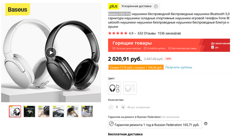 Недорогие беспроводные складные полноформатные наушники Baseus D02 Pro. Выглядят очень хорошо. Есть в черном и белом варианте. Поддерживают кодек AAC. Время автономной работы - до 40 часов. 632 отзыва, все отличные.