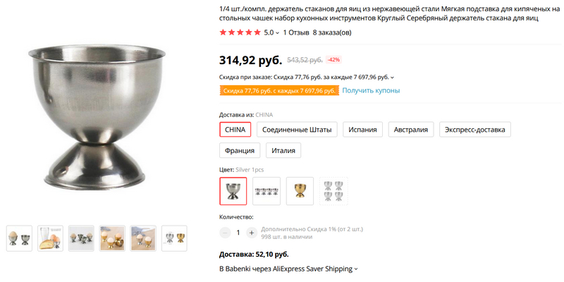 Металлические подставки под вареные яйца. Стальные, серебристые и золотистые. Стальные отлично коррелируют с айершаллензолльбрухштелленферурзахером. Кстати, четыре серебристых подставки почему-то стоят почти столько же, сколько одна стальная. Но стальная, как мы уже выяснили, лучше подходит айершаллензолльбрухштелленферурзахеру.