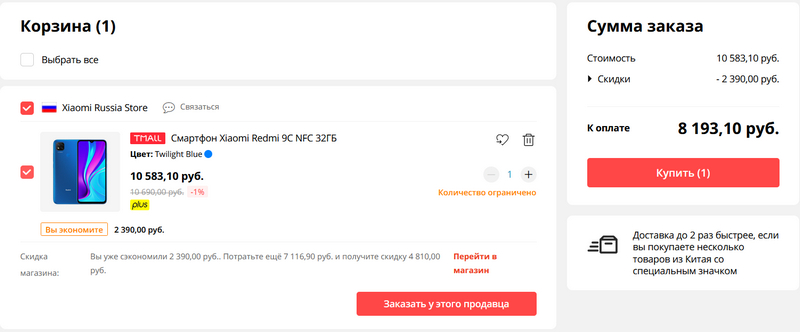 Еще бывает вариант, когда и купоны не нужно собирать и применять: там просто в этот день применяются скидки при покупке - вот, например, 21 мая был такой смартфон, скидку сделали 2390 рублей.