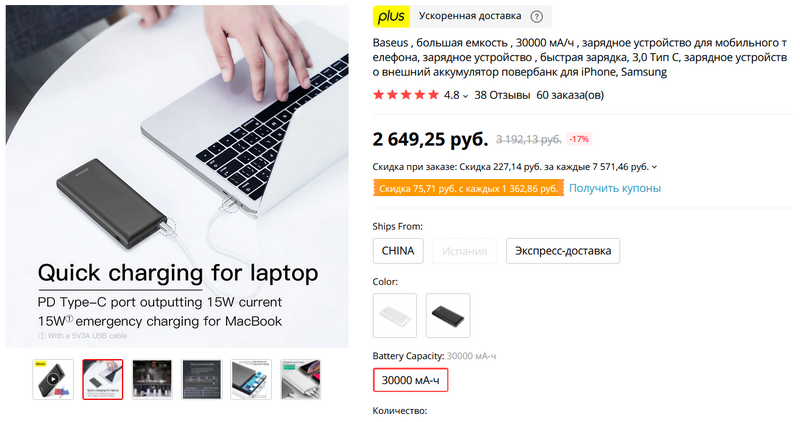 Внешний аккумулятор от Baseus на 30 000 мА·ч - для зарядки чего угодно, включая ноутбуки. Поддерживает зарядку до 15 ватт и сам заряжается на мощности до 15 ватт.