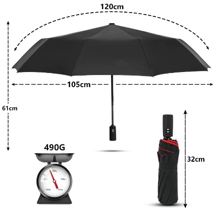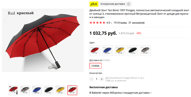 Двойной зонт различных расцветок с усиленной защитой от ветра. Правда, сколько километров в час выдержит - не сообщается. В отзывах пишут, что достаточно надежный, хотя и не слишком легкий. Но оно и понятно: у меня есть очень крутой и дорогущий зонт, который не вывернуть даже шквальным ветром, но он конкретно тяжеленный. Хорошо, что в Испании почти нет дождей, поэтому зонт третий год так и лежит в багажнике машины, увидев за свою жизнь дождь только один раз.