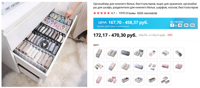 Различные органайзеры для белья. Реально полезная штука: я с их помощью в своем комоде такой порядок навел, что аж самому страшно. А раньше, чтобы найти нужную майку, приходилось перебирать всю коллекцию. Оно, конечно, тоже занятие увлекательное, но ведь сколько времени на это уходило...