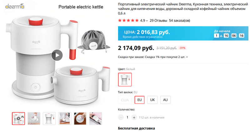 Забавная штука - портативный складной чайник Deerma. В сложенном виде занимает всего 10 см высоты. Может вскипятить 600 мл воды за 7 минут. Соответствует европейскому стандарту безопасности, прикольный и симпатичный. Отличная и безопасная замена посконному и домотканому кипятильнику.