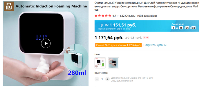 Настенный вспенивающий диспенсер для мыла от дочки Xiaomi Yopin. Белого или черного цвета. Имеет дисплей, на который выводятся температура помещения и уровень заряда устройства. Для некоторых пользователей такой диспенсер может оказаться удобнее обычного, ставящегося на раковину.