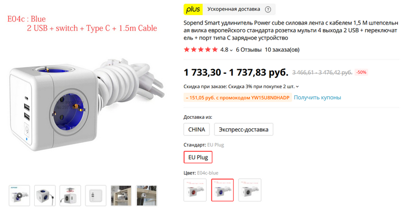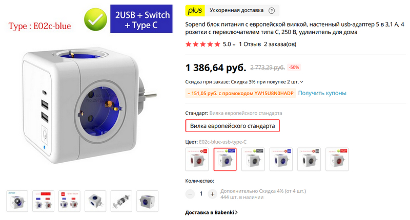 И у того же производителя есть удлинитель такого же типа - с розетками и USB-портами. Там есть ускоренная доставка.