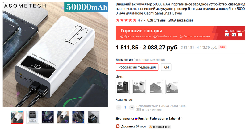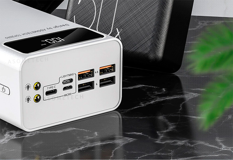 Для тех, кому нужна истинная мощь, - аккумулятор аж на 50 000 мА·ч. Два порта USB-A для быстрой зарядки (могут заряжать одновременно два устройства), еще два порта USB-A, порт Type-C, microUSB и Lightning - полный комплект. И еще два фонарика. Плюс дисплей, который показывает уровень заряда. В отзывах пишут, что емкость заявленной соответствует.