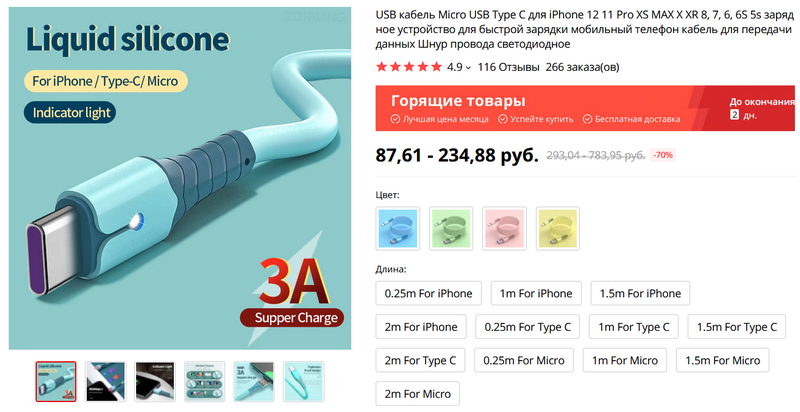Для владельцев айфонов - красивые цветные кабели различных размеров под разные типы портов. Кабели поддерживают быструю трехамперную зарядку, у них есть защита от излома.