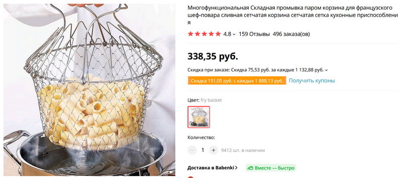 Складная металлическая корзинка для варки макарон, овощей и так далее. Убирает необходимость использования дуршлага: корзинка с продуктом достается из кастрюли, с нее стряхивается вода, после чего продукт выкладывается на тарелку.