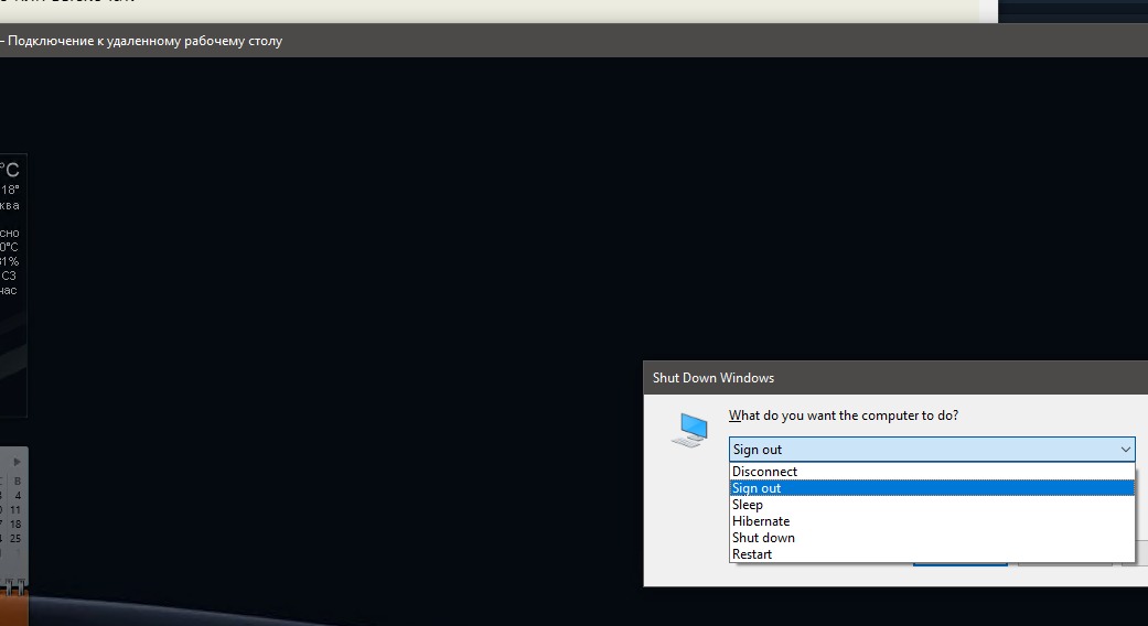 По RDP выключить у меня не получалось (Win 7 и 10).Можно только завершить сеанс.