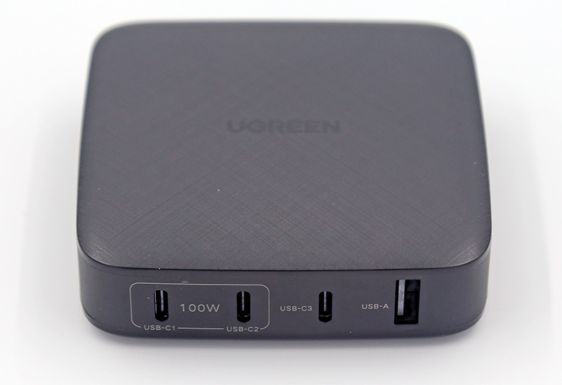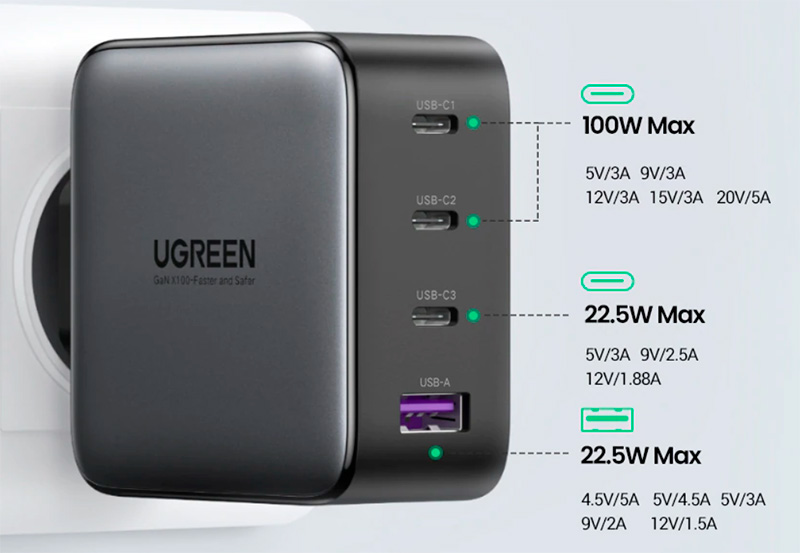Сам адаптер. Два порта USB-C, рассчитанных на 100 ватт, один порт USB-C на 22,5 ватта и порт USB-A на 22,5 ватта.