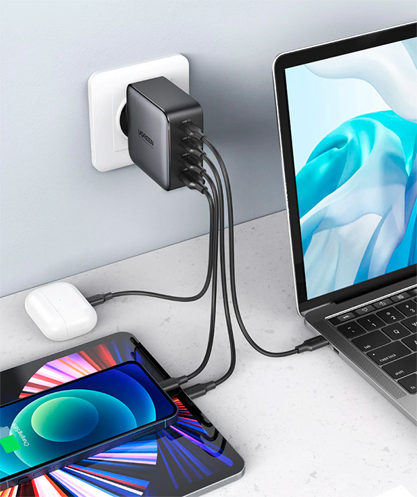 Ну и такой мощности хватит, чтобы и питать ноутбук, и одновременно быстро заряжать еще три устройства.