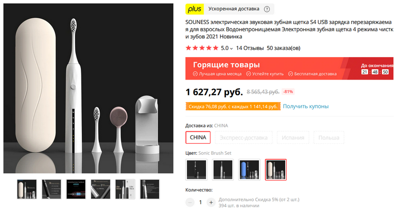 Новая вибрационная зубная щетка Souness S4. Четыре режима работы, одного заряда хватает на 50 дней использования, напоминание вибрацией об изменении зоны очистки. Просто щетка с запасной насадкой - тысяча рублей, а за 1627 рублей вы получаете щетку, запасную насадку, насадку для очистки лица, держатель и чехол.