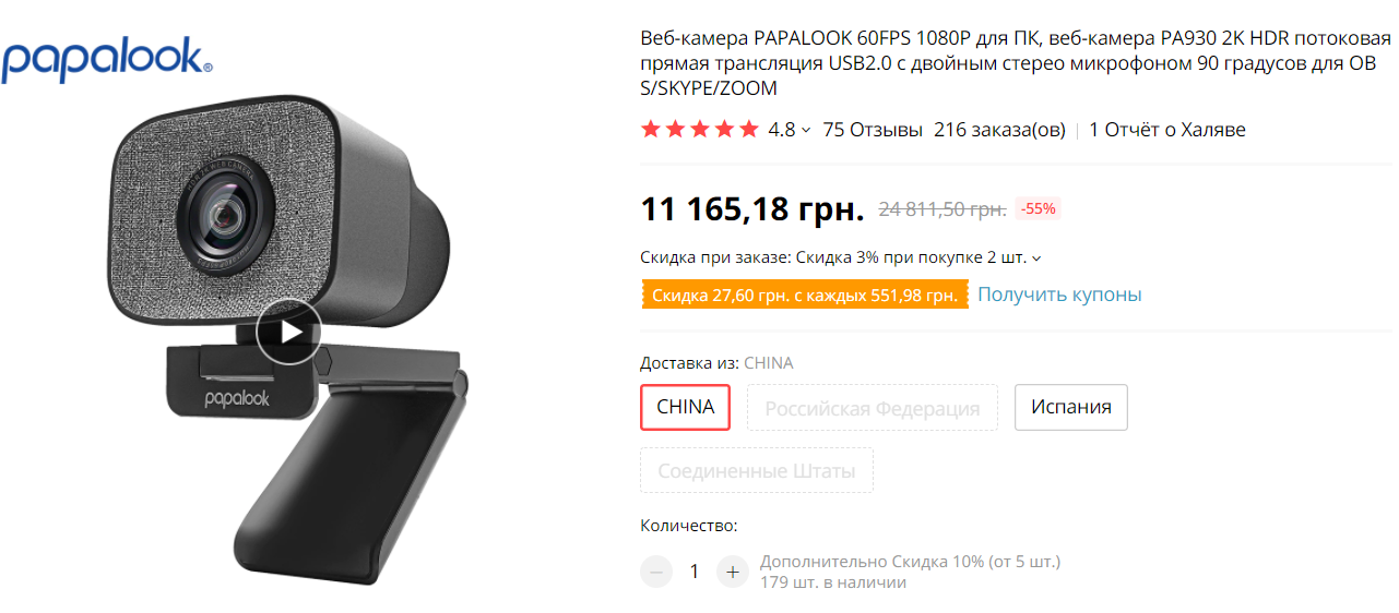 Интересная и недорогая веб-камера (стрим-камера) Papalook PA930. За 4,5 тысячи рублей вы получаете разрешение FullHD 60 fps или 30 fps, HDR, фиксированный фокус, широкий угол 90 градусов (для 60 fps угол 65 градусов), крепление на монитор, отдельный трипод, крышку на объектив, два встроенных микрофона.