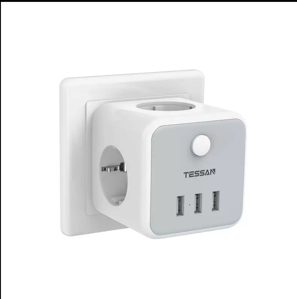 Удобный тройник под европейскую розетку: три розетки и три USB-порта.
