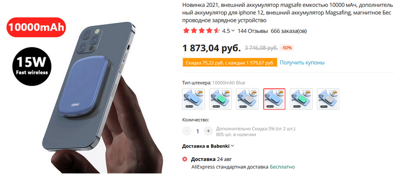 Внешний аккумулятор на 10 000 мА·ч, поддерживающий быструю зарядку мощностью 15 ватт. Прежде всего предназначен для айфонов 12-й серии, потому что поддерживает магнитное крепление MagSafe. (Напомню, что фирменный внешний аккумулятор от Apple имеет емкость всего 1460 мА·ч и стоит 10 тысяч рублей.)