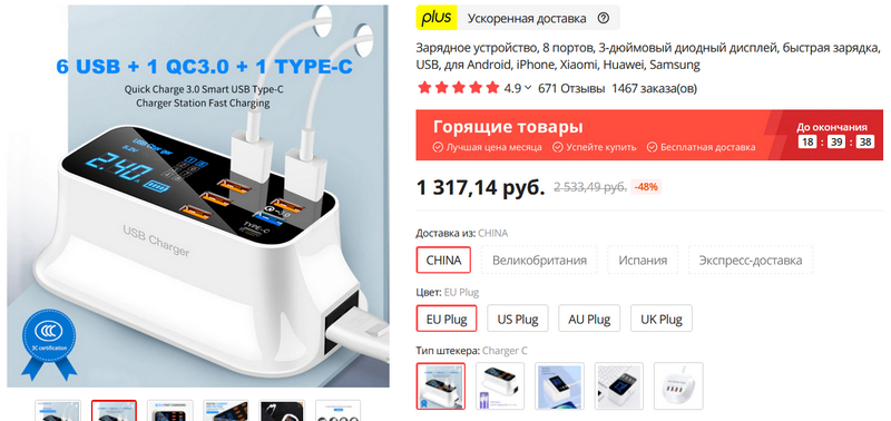 Варианты для тех, кому приходится заряжать несколько различных устройств: зарядный блок с дисплеем, показывающим параметры зарядки, семь портов USB-A (один из них поддерживается QC 3.0), один порт Type-C.