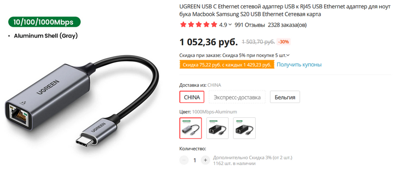 Полезная штука для современных ноутбуков - переходник с Type-C под сетевой кабель RJ-45. У меня такой под USB-A есть, а вот под USB-C как раз нет, заказываю.