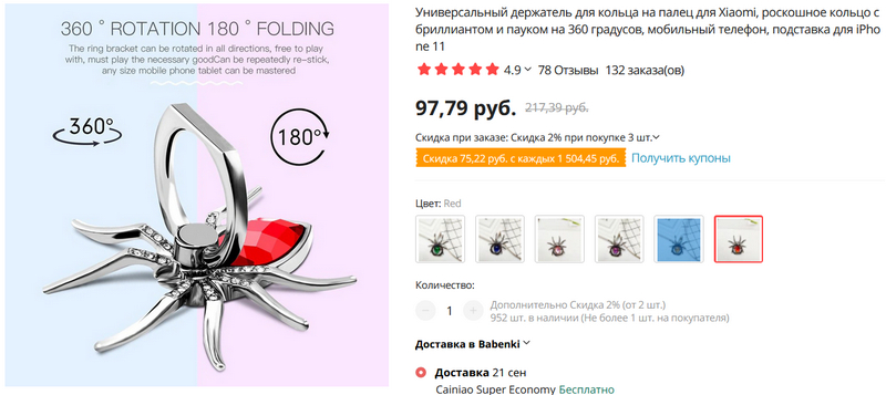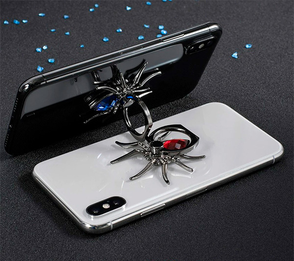 Забавная штука - подставка-держатель для смартфона в виде паучка с красивым камнем. Кольцо-держатель поворачивается на 180 градусов и крутится на 360 градусов. Пишут, что крепко держится на задней крышке смартфона или на чехле.