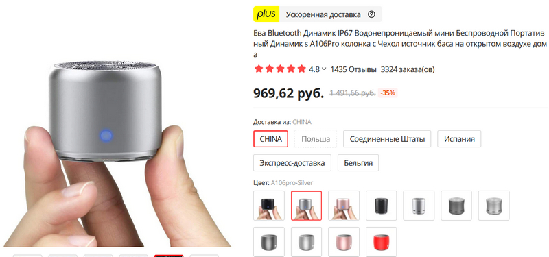 Очень маленькая беспроводная влагозащищенная колонка различных цветов. Мощность - 3 ватта, в отзывах пишут, что довольно громкая. В комплекте к ней идут чехол и кабель для зарядки.