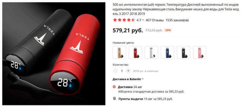 Компактные стильные металлические термосы на 500 мл с логотипом и надписью Tesla на них. Шесть цветов. На крышке термоса расположен дисплей, при прикосновении показывающий температуру напитка. "Купи себе немного Tesla" - слоган этого термоса.