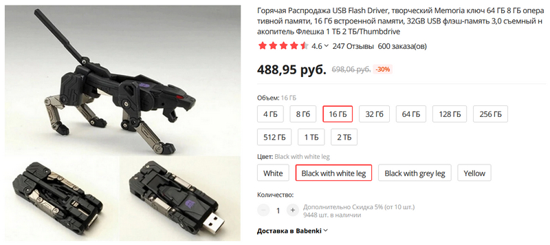 Флешка-трансформер, умеющая превращаться в пуму. Дети от такой должны быть в восторге: и тебе флешка, и крутая игрушка. Любой емкости: от 4 ГБ до 2 ТБ. Большие емкости стоят совершенно негуманно, но какой смысл покупать флешку более 16-32 ГБ? А 16 ГБ стоят всего 500 рублей.