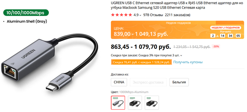 Полезная штука для современных ноутбуков - переходник с порта Type-C на кабель RJ-45 для проводного Интернета. Есть вариант на 100 мегабит - подешевле, и гигабитный переходник (что предпочтительнее, конечно).