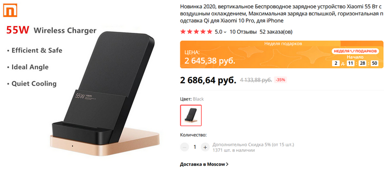 Наконец-то реально мощная беспроводная зарядка от дочки Xiaomi на 55 ватт. Мой смартфон поддерживает беспроводную зарядку такой мощности, а обычно попадаются беспроводные зарядки на 10-15 ватт. Некоторое время назад я писал о зарядке на 27 ватт (я ее купил, и она реально работает), но 55 ватт - это круто, заказал. Только имейте в виду, что у нее есть кулер, потому что тут требуется воздушное охлаждение. У моей зарядки на 27 ватт кулер тоже есть, но его почти не слышно.