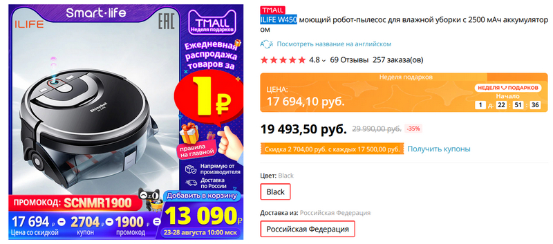 Кстати, по поводу скидок. Недорогой моющий робот-пылесос ILIFE W450 с доставкой с российского склада.