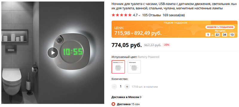 Ночник с датчиком движения и часами - для туалета и других помещений. Есть вариант на батарейках, а есть с зарядкой от USB-порта.