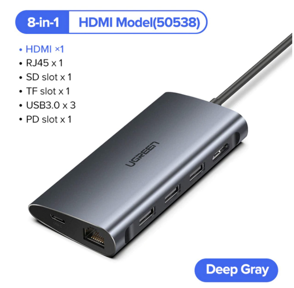 Рекомендую добавить и взять сразу вот такой концентратор Ugreen, который тоже подключается в порт Type-C и где есть RJ45+HDMI++SD/TF+3*USB3.0+PD.