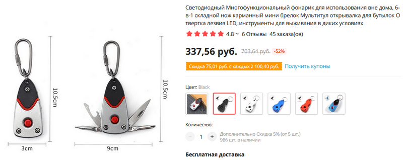Небольшой мультитул, который можно носить в качестве брелка. И в качестве брелока тоже. И у него есть фонарик. Доступны несколько вариантов цветового оформления.