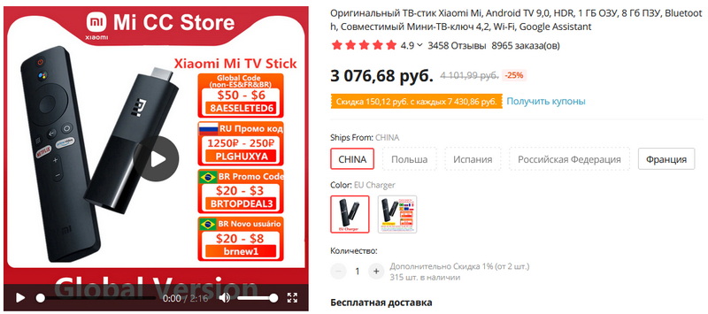 Медиаприставка Mi Tv Stick - штука известная и очень популярная (мой обзор). На "Яндекс.Маркете" ее можно купить за 4-5 тысяч. А вот на Aliexpress сейчас есть вариант покупки за 3 тысячи рублей. Плюс промокодом PLGHUXYA цену  еще можно скинуть.