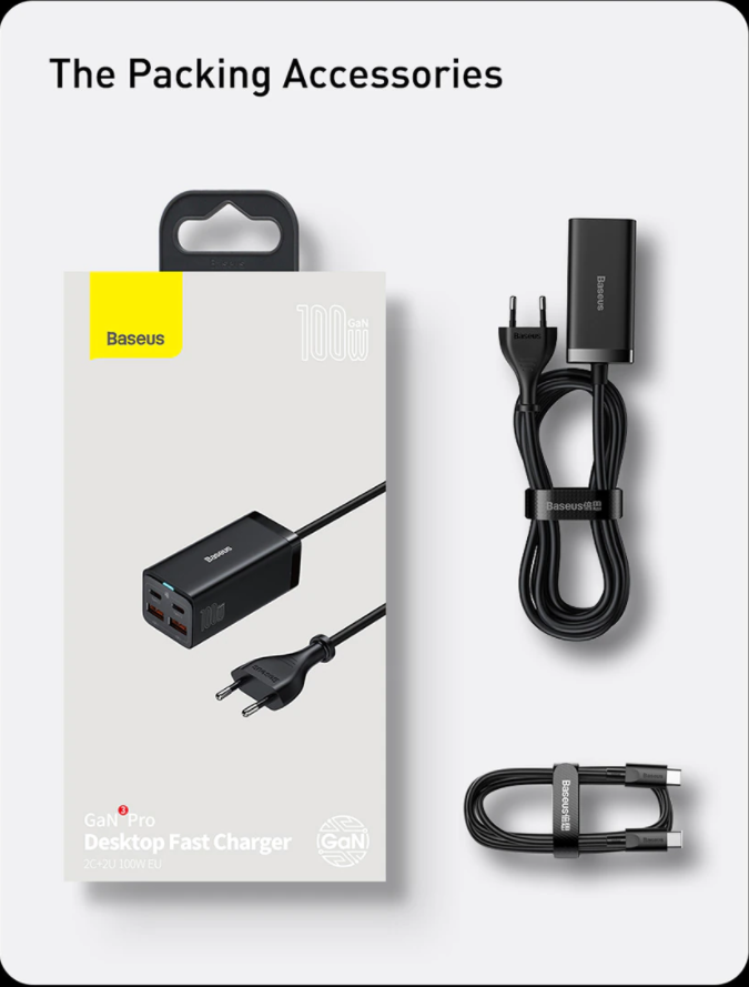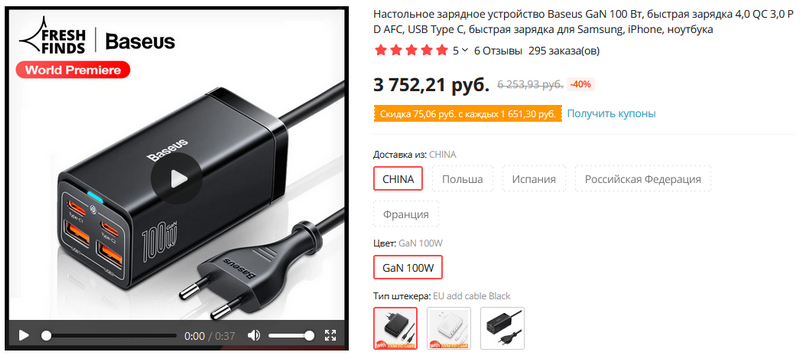 Зарядный GaN-адаптер от Baseus на 4 порта (два USB-C и два USB-A) на 100 ватт. Два цвета, есть под розетку и вариант со своим кабелем. Плюс есть промокод на скидку TRENDSALE350.