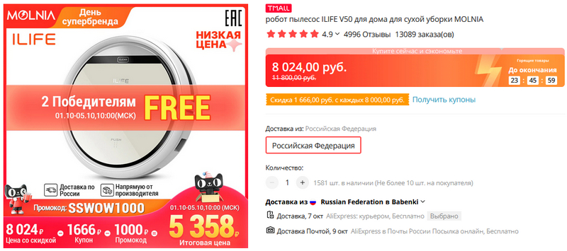 Недорогой робот-пылесос ILIFE V50 для сухой уборки. Три режима уборки, уборка по расписанию, автономность до 100 минут, определяет лестницы и сам возвращается на зарядку. Доставка с российского склада. Есть купон продавца на скидку 1666 рублей, есть промокод WOWSUPER800, который также снизит цену.