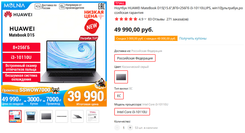 Есть хороший вариант почти на 10 тысяч понизить цену ультрабука HUAWEI MateBook D15 с российской гарантией и поставкой с российского склада. (Я писал обзор похожей модели MateBook D14.) Берите купон продавца (скидка 3 тысячи), также используйте промокод TRDSS7000. Эх, знал бы я сам об этом варианте, когда пару дней назад искал в Москве ноутбук для родственника...