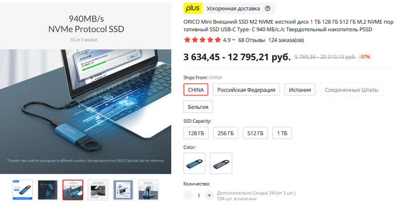 Внешний очень быстрый SSD M2 NVME от компании Orico различных размеров от 128 ГБ до терабайта. Есть доставка с российского склада.