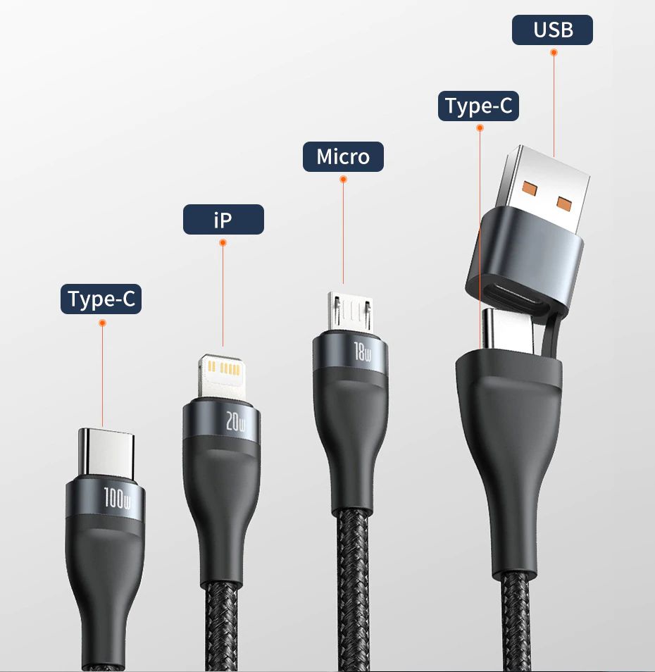 Очень рекомендую мощный кабель фирмы Baseus. Вход USB или Type-C (5А). Выходы: MicroUSB 2A(QC 18Вт), ТуреС PD 100Вт, iP PD 20Вт. Есть поддержка передачи данных. Длина шнура 1,2. Защита от перегибов. Удобно в поездках.