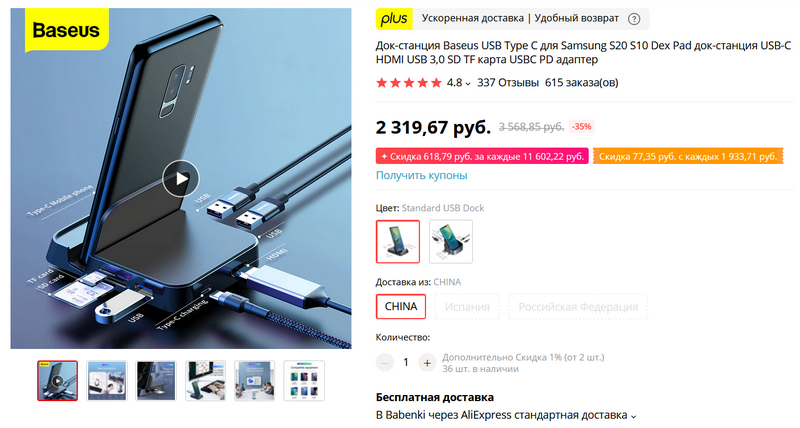 Внимание: проводное подключение через эту док-станцию к мониторам/проекторам доступно только для смартфонов с поддержкой Display Port через USB-C. Их список приведен по ссылке на док-станцию.