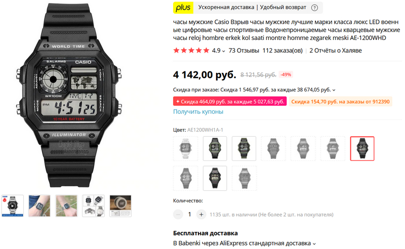 Кстати, если кого-то при упоминании классических Casio ностальгия плотно схватила за горло, то нет поводов отчаиваться - Casio AE-1200WHD тоже запросто можно купить (по слухам, именно эта модель сейчас в Китае и производится). Разные конфигурации и разные цветовые решения.