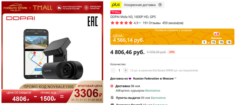 Интересный вариант для распродажи - очень компактный видеорегистратор DDPai Mola N3. Разрешение 2560x1600 (1600p), угол 140 градусов, есть G-сенсор, GPS и Wi-Fi. Он без дисплея, настраивается со смартфона - вот страница данной модели на официальном сайте. Производитель вполне достойный, у меня был на обзоре их видеорегистратор DDPai Mini5, также у меня еще одна модель ждет теста.