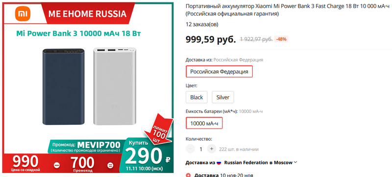 На внешний аккумулятор Xiaomi Mi Power Bank 3 емкостью 10 000 мА·ч и мощностью 18 ватт 11 ноября обещают уронить цену всего до 290 рублей по промокоду MEVIP700.