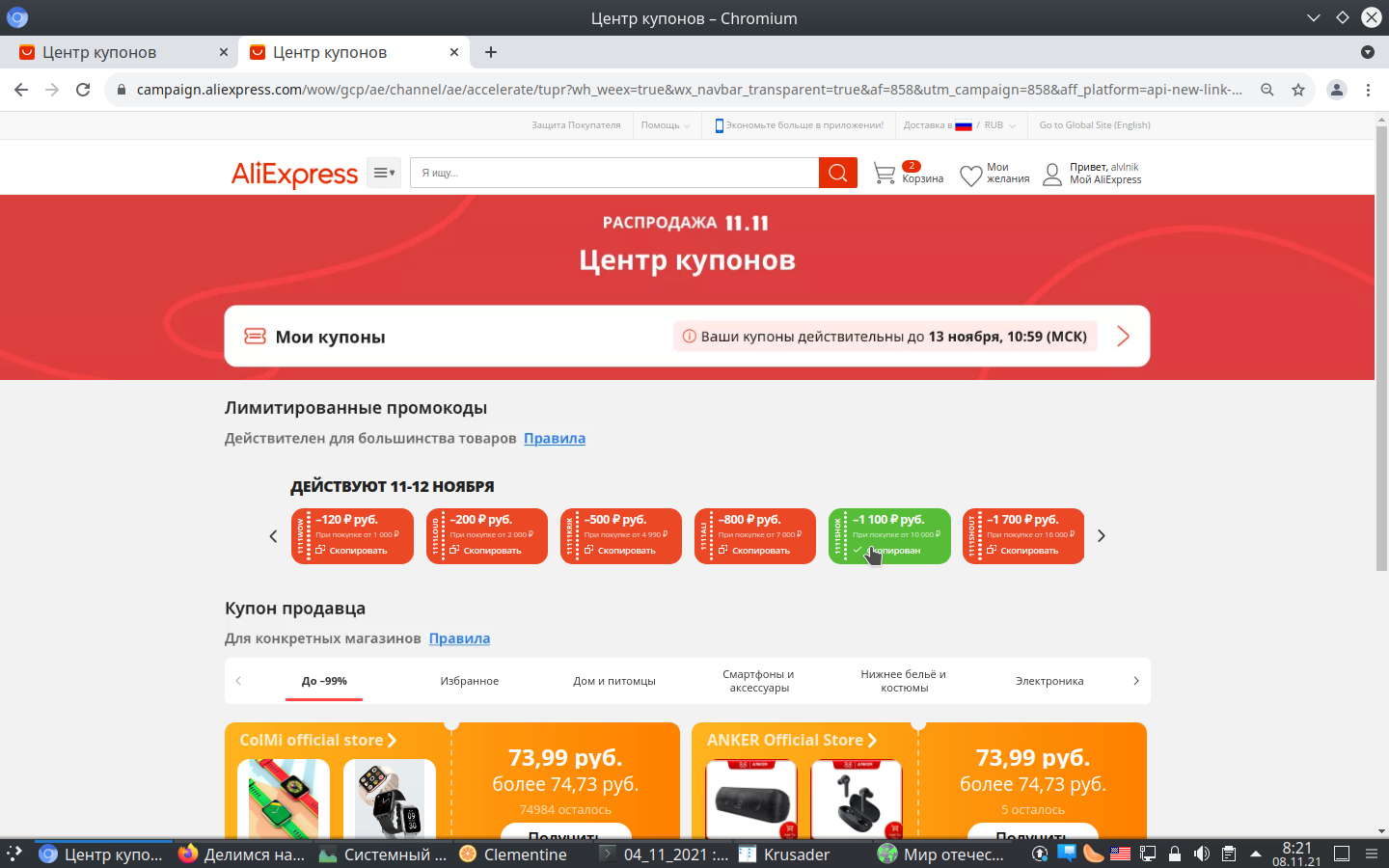 У меня есть солидная порция новых моих персональных промокодов (от 100 до 800 рублей), которые мне предоставляет Aliexpress, но они начнут действовать с 11 ноября, так что я их 11 ноября на старте распродажи и опубликую - все равно, как обычно, буду делать специальный пост, чтобы вы могли делиться своими находками.