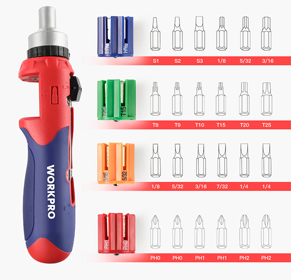 Любопытная какая штука: отвертка с автоматической сменой бит из барабанного отсека. В комплект входят 24 биты. Есть доставка с российского склада. (С испанского тоже есть, я себе заказал.)
