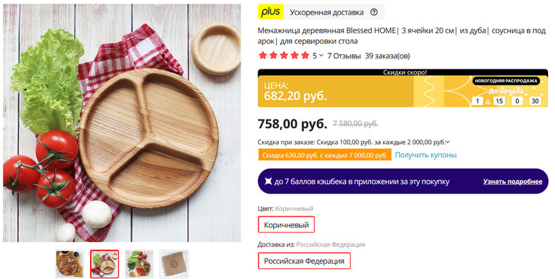 Деревянная менажница на 3 отделения диаметром 20 см. Жаль, что доставка только в Россию, я бы себе такую заказал, люблю такие штуки: у нас дома уже целый набор самых разнообразных деревянных подносиков, они на праздничном столе отлично смотрятся.