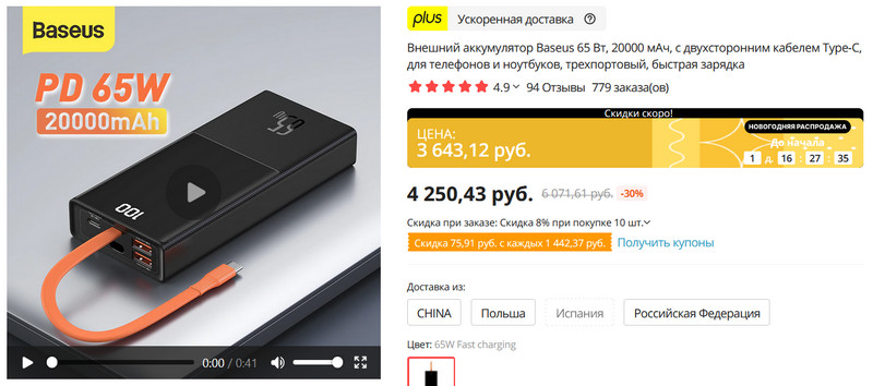 Аккумулятор на 20 000 мА·ч от Baseus: встроенный кабель Type-C (люблю такое, удобно), PD на 65 ватт, то есть может заряжать ноутбуки, два порта USB-A и два порта USB-C, может заряжать одновременно до трех устройств (20, 30 и 15 ватт), имеет дисплей с указанием уровня заряда, аккумулятор сам поддерживает быструю зарядку и полностью заряжается за 90 минут, поддерживает протоколы быстрой зарядки PD , QC, SCP, FCP, AFC и PE +. И есть доставка с российского склада. Чего еще можно желать?