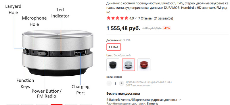 Малюсенькая вибрационная беспроводная колонка диаметром всего 4 сантиметра. У меня есть маленькая колонка такого типа, она очень прикольная: ставится или присасывается к поверхности стола, после чего сам стол начинает выступать как бы сабфувером, и эта малютка выдает на удивление мощный и насыщенный звук. Но еще прикольнее ее прилеплять к стеклу, особенно если поверхность стекла достаточно большая - там звук получается еще мощнее и интереснее.