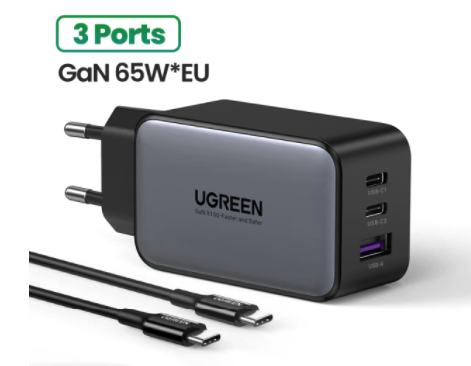 Компактная GaN зарядка от UGREEN на 65 Ватт и европейской или американской вилкой на выбор. 3 порта - 2 usb-c и один usb-a. Дополнительно можно заказать кабель usb-c <-> usb-c.