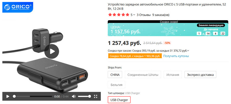 Если приходится в машине заряжать несколько устройств, а в особенности когда еще и требуется подзарядка на заднем сиденье, вот отличный вариант от Orico (люблю я этого производителя, у меня немало их устройств) - адаптер с двумя портами и еще один хаб с тремя портами. Общая мощность - 52 ватта, хватит для всего.